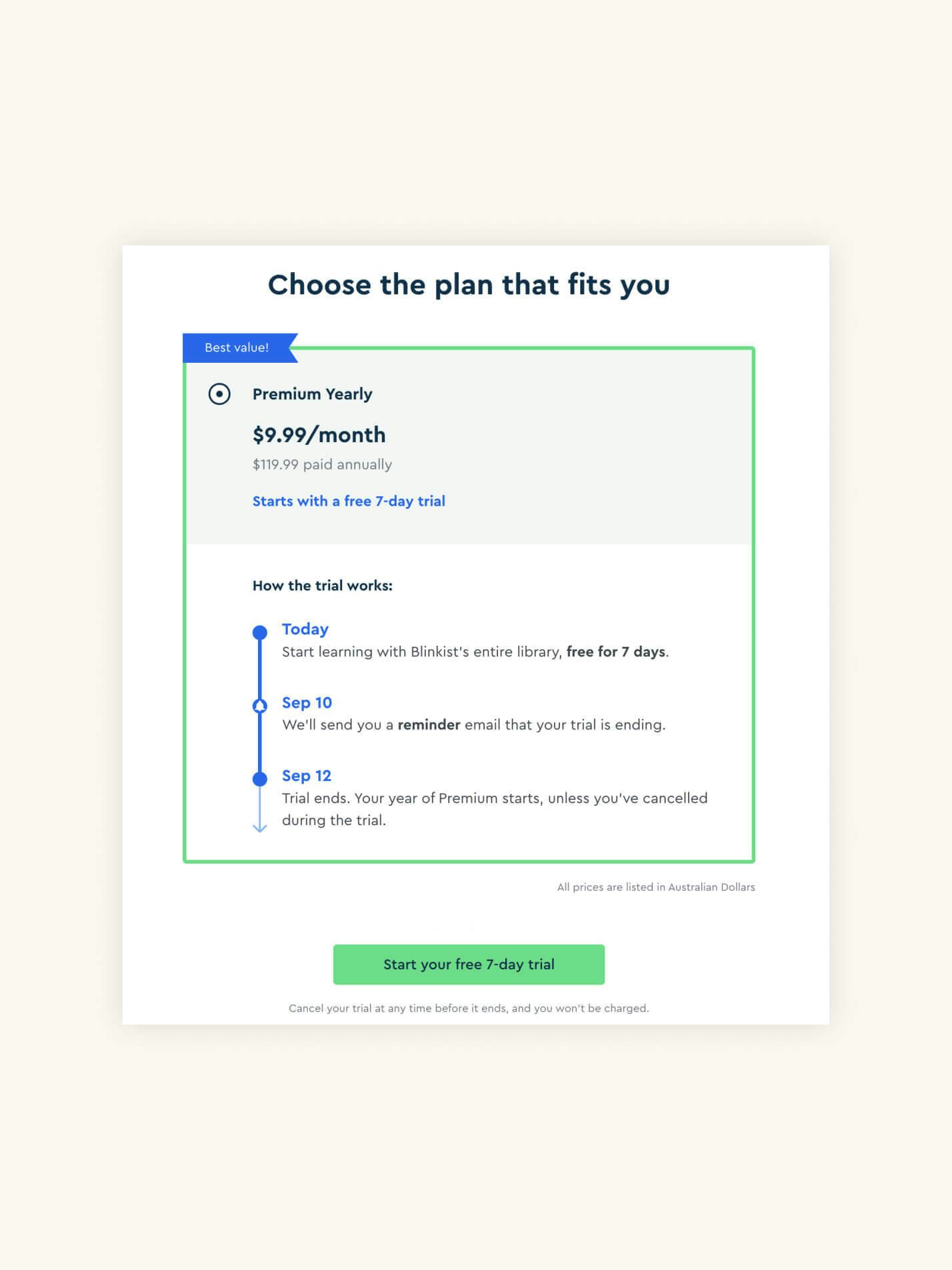 Blinkist (left) does an excellent job of explaining their free trial clearly and enticingly. The openness of their process is particularly compelling as it emphasises customer control — at several points, the supporting assurance copy references the ability of the customer to cancel their trial at any time, even to the point where Blinkist provide reminder emails so people don't unwillingly roll over into a paid plan. They even re-emphasise this aspect of the trial directly below the primary call to action.
